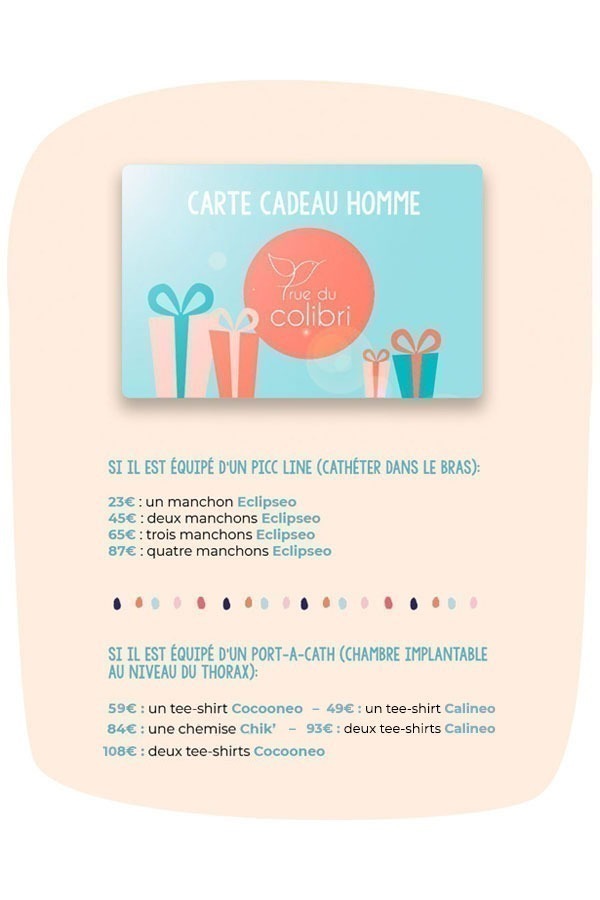 Avec la carte cadeau pour un patient atteint du cancer, vous offrez à votre proche la possibilité de choisir entre vêtement et/ou accessoire adapté à ses goûts et à sa taille.