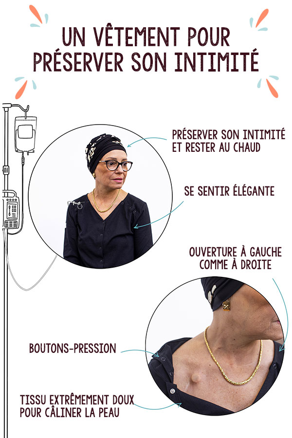 C’est le cas du vêtement. Pendant la maladie, on le rêve source de confort, de chaleur et de douceur, pour compenser l’agressivité des traitements. On le rêve alors pratique, facile à enfiler et à enlever pour tous les moments où il faudra se déshabiller. Mais également joli, pour aider à préserver une image malmenée…