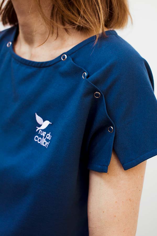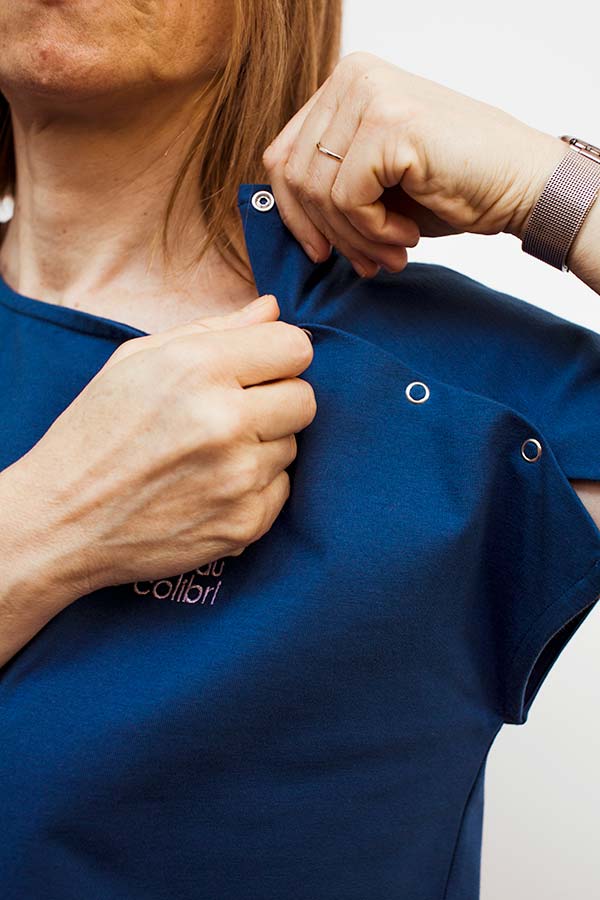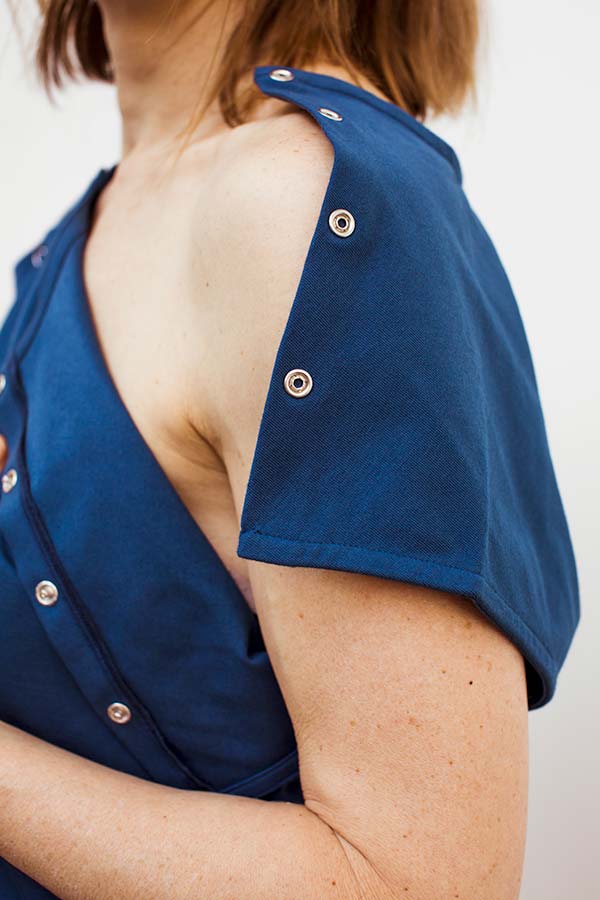 Grâce à son astucieux système d’ouvertures par boutons-pression, le T-shirt Cocoonea s’ouvre aussi bien à gauche qu’à droite pour faciliter la désinfection par le personnel médical et le branchement de la perfusion. Une fois posée, on referme simplement les boutons-pression autour du tube pour rester au chaud pendant toute la séance de chimio. Intimité préservée !