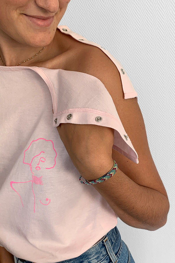 Vivre avec plus de légèreté son parcours de soins. Conserver son intimité à tout moment, avec sa chambre implantable (boîtier fixé sous la peau du thorax pour faciliter les perfusions) visible ou dissimulé selon les besoins. Se sentir belle même quand on passe une demi-journée à l’hôpital. Garder son autonomie avec une mobilité réduite du bras. Porter sur soi un message qui ressource. C’est la promesse de Calinea collection capsule, dont le système d’ouverture s’adapte à toutes les situations de vie : le vêtement pour femme facile à enfiler et adapté à la perfusion, illustré pour un soutien encore plus fort.