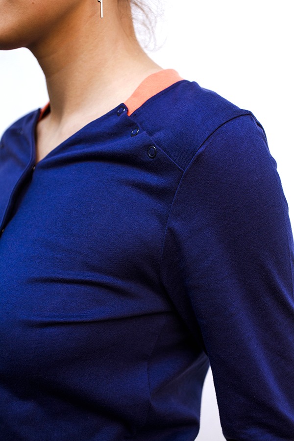 La version T-shirt Cocoonea du vêtement pour femme spécial chimio apporte également ses bienfaits tout au long du parcours de soins de cancer. Il est parfaitement adapté pendant la phase de radiothérapie, avec son tissu ultradoux que les peaux fragilisées adorent. Egalement, il est utile après une chirurgie qui touche le buste (sein, ganglions…) et perturbe la mobilité d’un bras. En effet, on peut passer la manche sans avoir à lever le bras fragilisé. Puis on enfile l’autre manche avant de fermer la ligne verticale de boutons-pression.