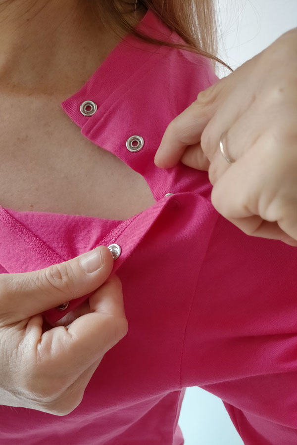 Un astucieux système d’ouvertures par boutons-pression équipe le T-shirt Cocoonea. Il s’ouvre ainsi aussi bien à gauche qu’à droite pour faciliter la désinfection par le personnel médical et le branchement de la perfusion. Une fois posée, on referme simplement les boutons-pression autour du tube pour rester au chaud pendant toute la séance de chimio. Intimité préservée !