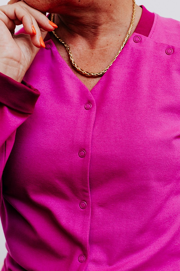 Sa coupe ajustée, son col en V, ses boutons discrets, son mariage de couleurs féminines pleines de vitalité en font le tee-shirt idéal à porter chaque jour. Restez femme, restez belle, tout en recevant votre traitement avec le maximum de bien-être. Et portez-le en toute saison avec ses manches longues.