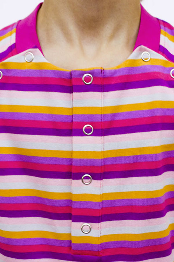 Par ses boutons-pression bien positionnés, le T-shirt Cocoon’Kid dispose d’un système d’ouverture parfaitement adapté aux contraintes d’un cathéter dans le thorax : chambre implantable (ou Port-à-cath®), Broviac®.